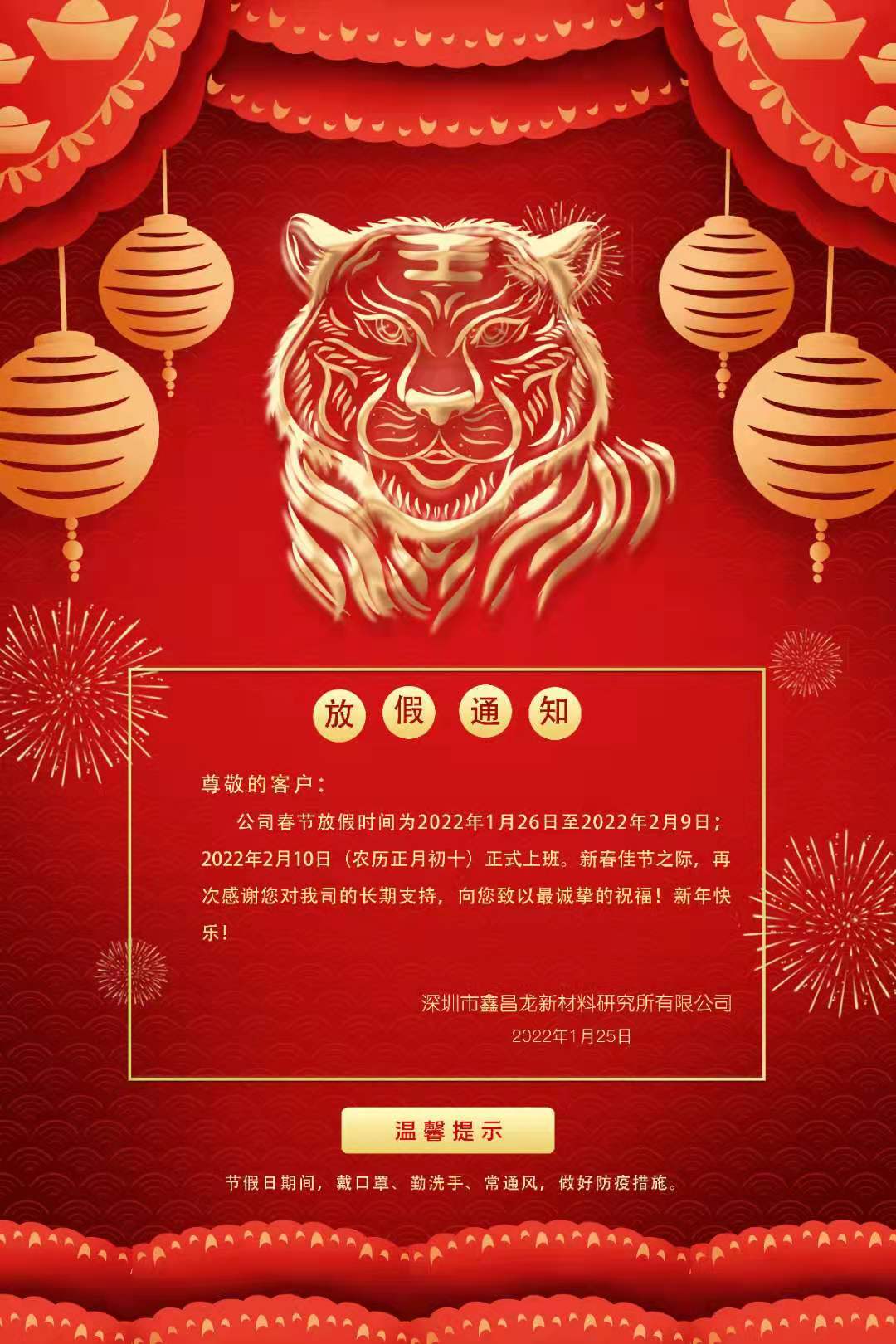深圳市鑫昌龍新材料研究所有限公司2022年春節(jié)放假通知